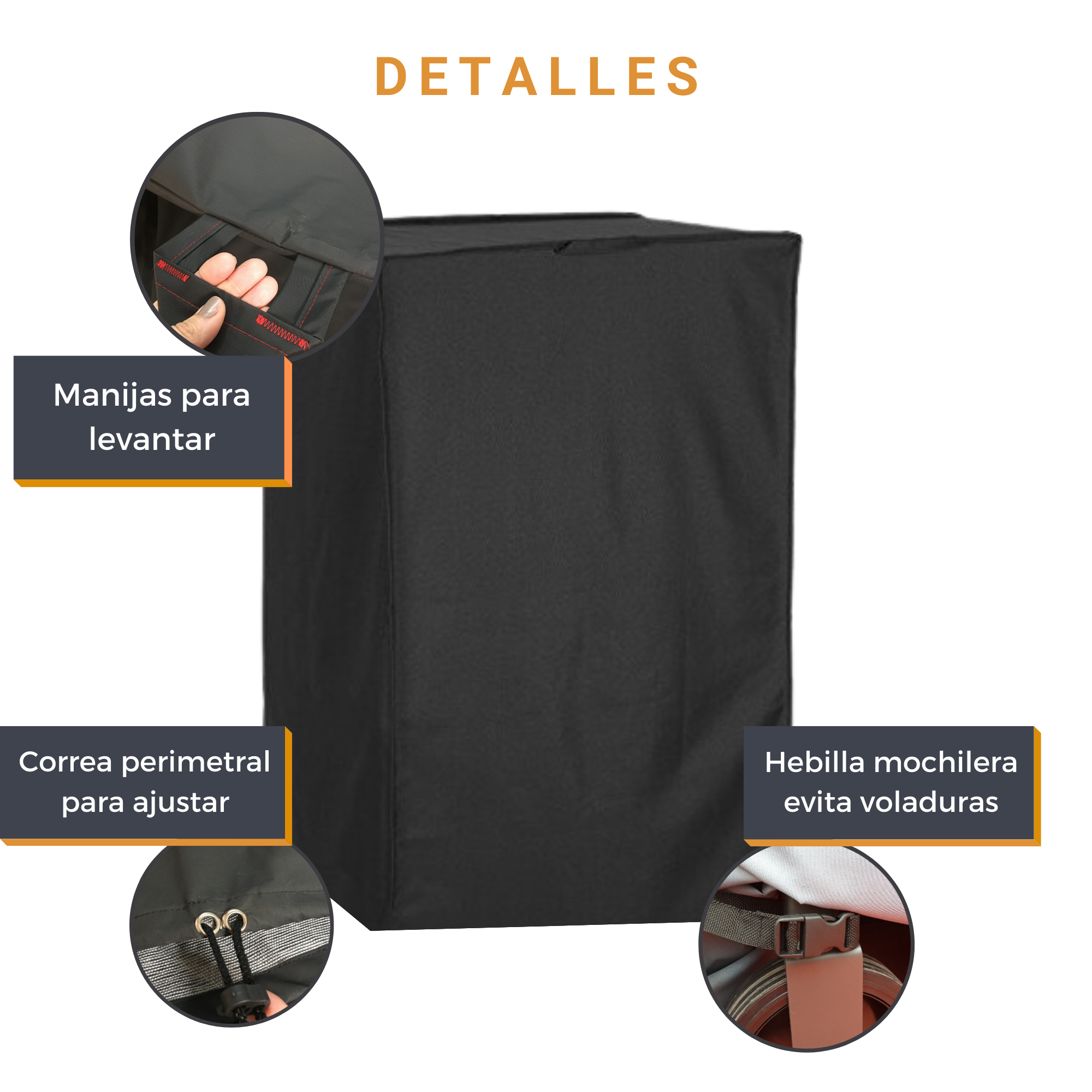 EXCELENTE FIJACIONES Y AJUSTE: incluye características únicas como un CORDON CON TANCA de ajuste en la base para una fijación adecuada a la parrilla y además gracias al gancho OneClick (HEBILLA MOCHILERA) no tenés que preocuparte más de que tu funda se vuele con el viento. Adicionalmente nuestro diseño exclusivo incorpora TIRAS DE SUJECIÓN en la base para un ajuste perfecto de tu funda CoverAll® a las condiciones climáticas más extremas.