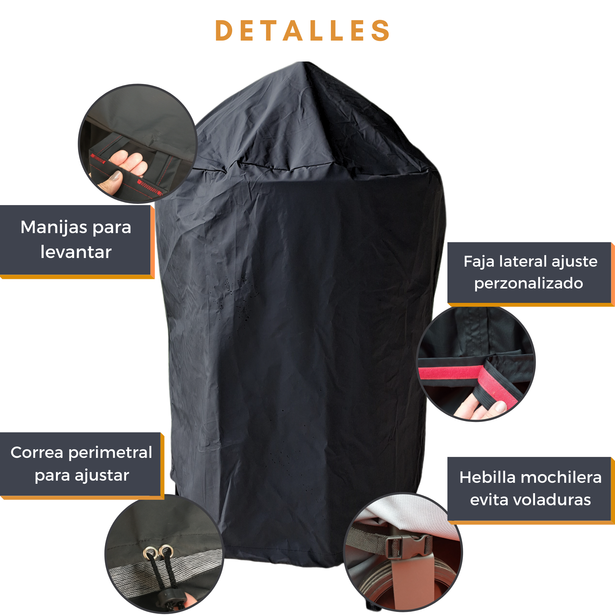 EXCELENTE FIJACIONES Y AJUSTE: incluye características únicas como un CORDON CON TANCA de ajuste en la base para una fijación adecuada a la parrilla y además gracias al gancho OneClick (HEBILLA MOCHILERA) no tenés que preocuparte más de que tu funda se vuele con el viento. Adicionalmente nuestro diseño exclusivo incorpora TIRAS DE SUJECIÓN en la base para un ajuste perfecto de tu funda CoverAll® a las condiciones climáticas más extremas.