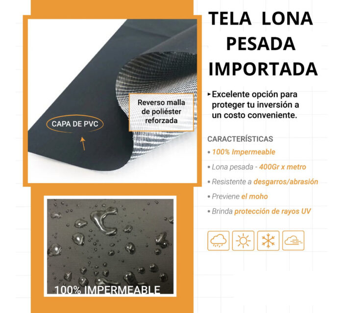 LONA IMPORTADA PESADA (380 gramos x m²) con PVC: Sabemos lo mucho que querés proteger tus bienes y por eso CoverAll® está hecha con TELA IMPORTADA DOBLE CAPA, que cuenta con una malla de poliéster plano 300 DTEX, recubierto con una capa de pvc de un espesor de 300 micrones.