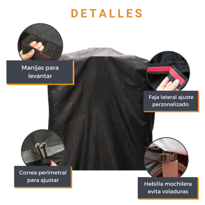 EXCELENTE FIJACIONES Y AJUSTE: incluye características únicas como un CORDON CON TANCA de ajuste en la base para una fijación adecuada a la parrilla y además gracias al gancho OneClick (HEBILLA MOCHILERA) no tenés que preocuparte más de que tu funda se vuele con el viento. Adicionalmente nuestro diseño exclusivo incorpora TIRAS DE SUJECIÓN en la base para un ajuste perfecto de tu funda CoverAll® a las condiciones climáticas más extremas.