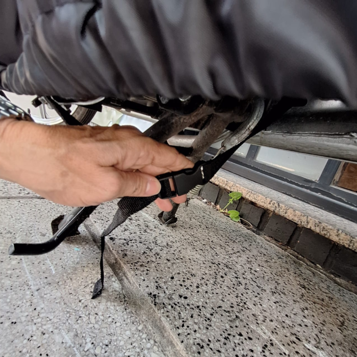 – Hebilla con tanca en el centro de la funda ajustable, evita voladura por el viento.