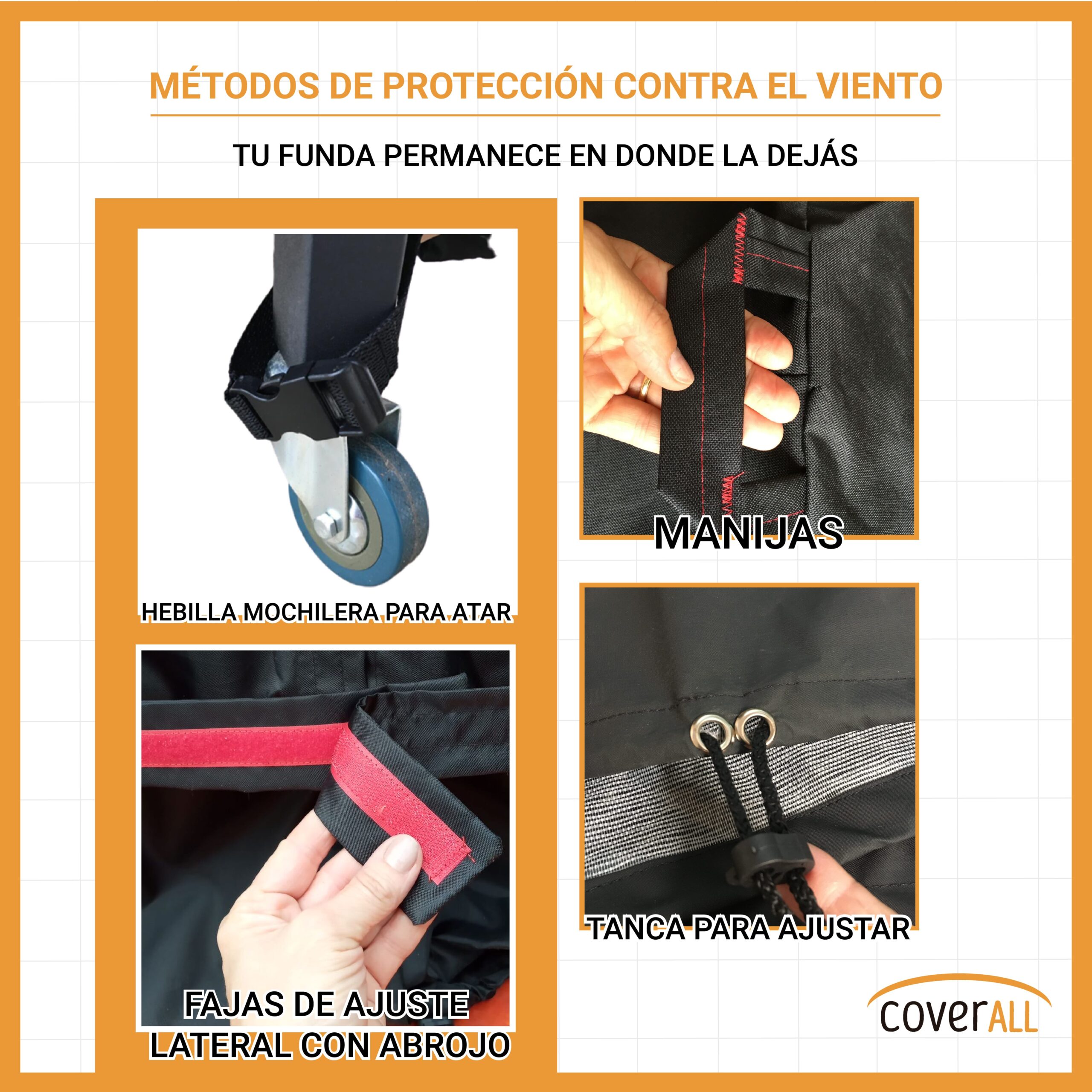 FACIL INSTALACIÓN Y EXTRACCIÓN: la practicidad para el uso de la funda CoverALL® está garantizada con su FAJA DE AJUSTE LATERAL (aplica según modelo) y la MANIJA DE AGARRE en la parte superior, lo que permiten un muy facil montaje y remoción.