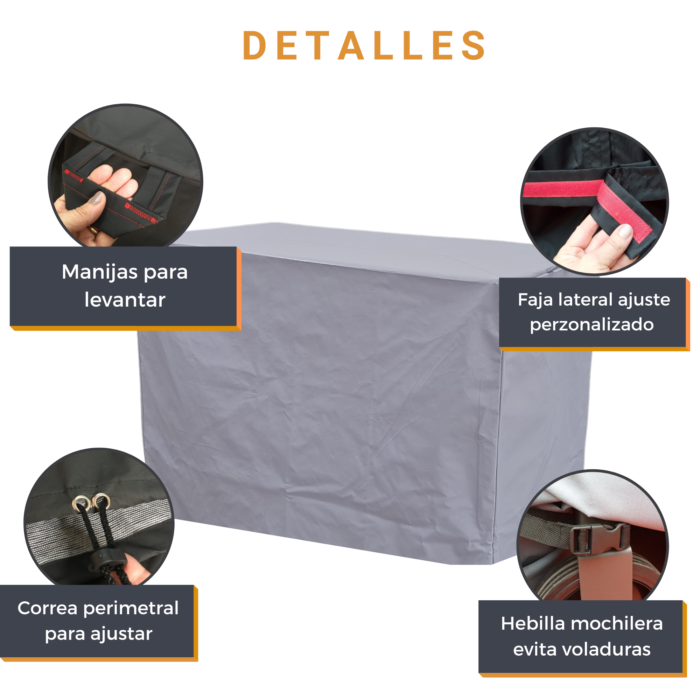 EXCELENTE FIJACIONES Y AJUSTE: incluye características únicas como un CORDON CON TANCA de ajuste en la base para una fijación adecuada a la parrilla y además gracias al gancho OneClick (HEBILLA MOCHILERA) no tenés que preocuparte más de que tu funda se vuele con el viento. Adicionalmente nuestro diseño exclusivo incorpora TIRAS DE SUJECIÓN en la base para un ajuste perfecto de tu funda CoverAll® a las condiciones climáticas más extremas.