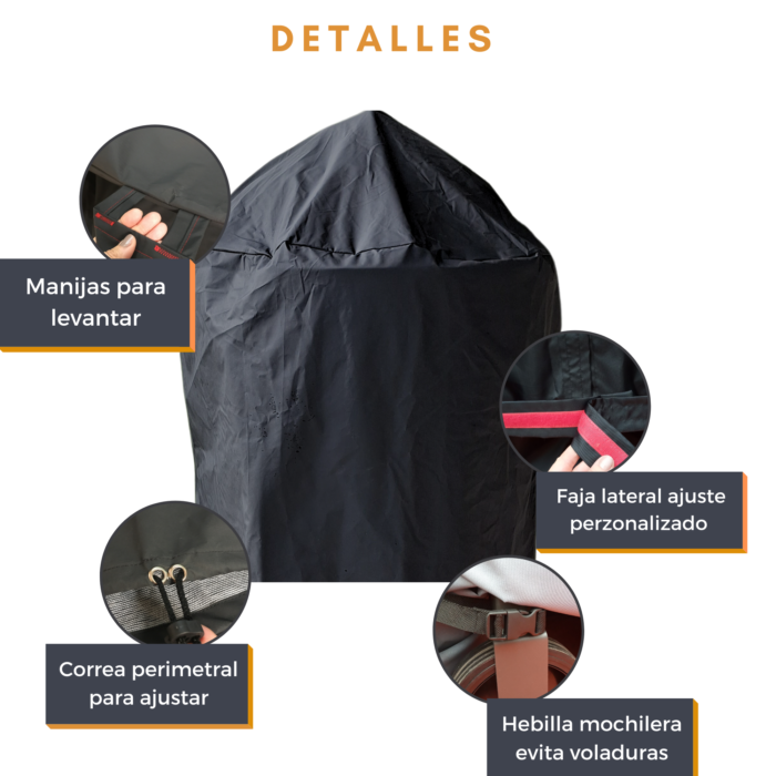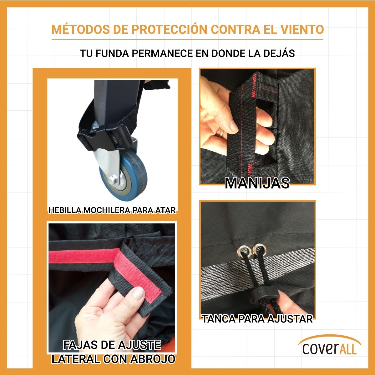 EXCELENTE FIJACIONES Y AJUSTE: incluye características únicas como un CORDON CON TANCA de ajuste en la base para una fijación adecuada a la parrilla y además gracias al gancho OneClick (HEBILLA MOCHILERA) no tenés que preocuparte más de que tu funda se vuele con el viento. Adicionalmente nuestro diseño exclusivo incorpora TIRAS DE SUJECIÓN en la base para un ajuste perfecto de tu funda CoverAll® a las condiciones climáticas más extremas.