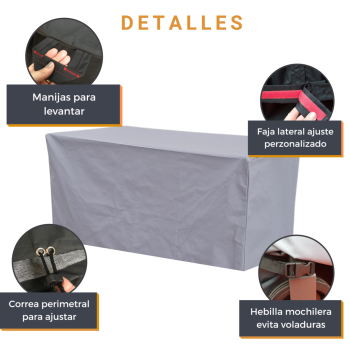 EXCELENTE FIJACIONES Y AJUSTE: incluye características únicas como un CORDON CON TANCA de ajuste en la base para una fijación adecuada a la parrilla y además gracias al gancho OneClick (HEBILLA MOCHILERA) no tenés que preocuparte más de que tu funda se vuele con el viento. Adicionalmente nuestro diseño exclusivo incorpora TIRAS DE SUJECIÓN en la base para un ajuste perfecto de tu funda CoverAll® a las condiciones climáticas más extremas.