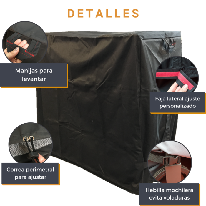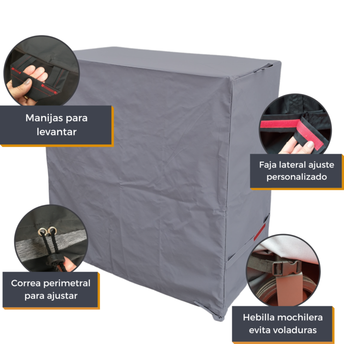 EXCELENTE FIJACIONES Y AJUSTE: incluye características únicas como un CORDON CON TANCA de ajuste en la base para una fijación adecuada a la parrilla y además gracias al gancho OneClick (HEBILLA MOCHILERA) no tenés que preocuparte más de que tu funda se vuele con el viento. Adicionalmente nuestro diseño exclusivo incorpora TIRAS DE SUJECIÓN en la base para un ajuste perfecto de tu funda CoverAll® a las condiciones climáticas más extremas.