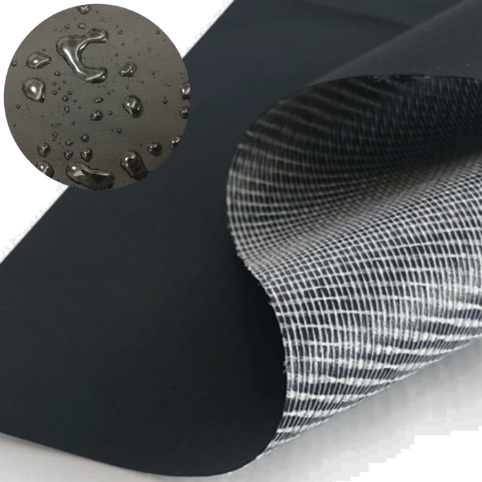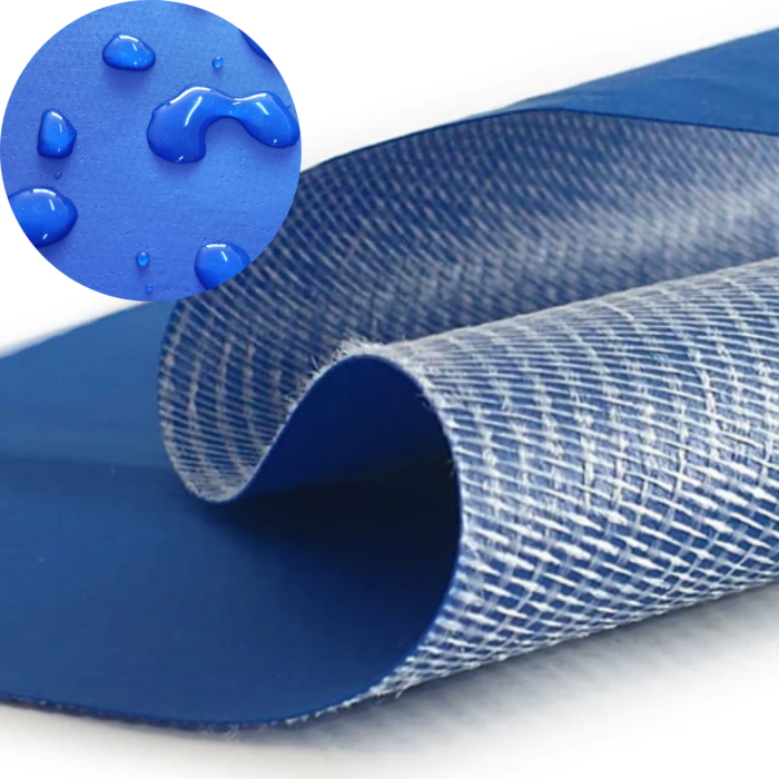 TELA IMPORTADA DOBLE CAPA, que cuenta con una malla de poliéster plano 300 DTEX, recubierto con una capa de pvc de un espesor de 300 micrones.